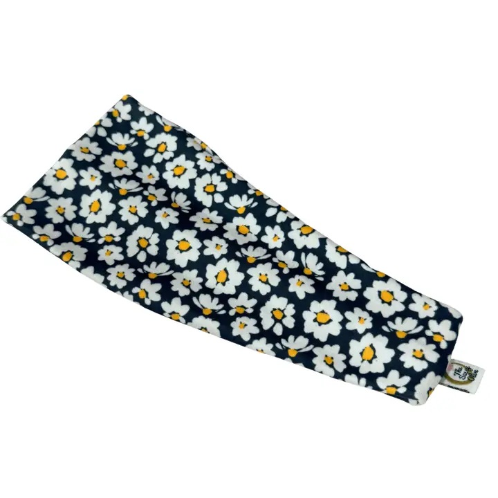 Black stretch headband with white daisies in a classic ditzy print. Handmade and ideal for everyday style.