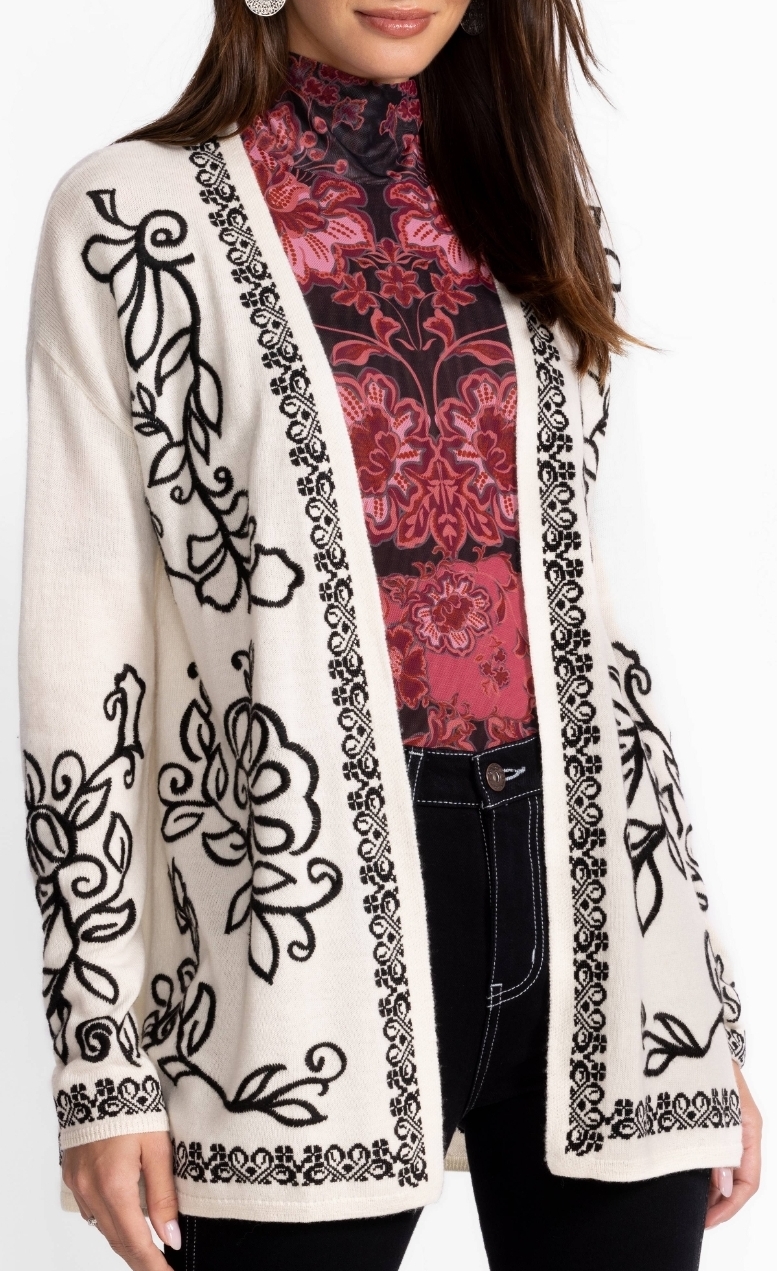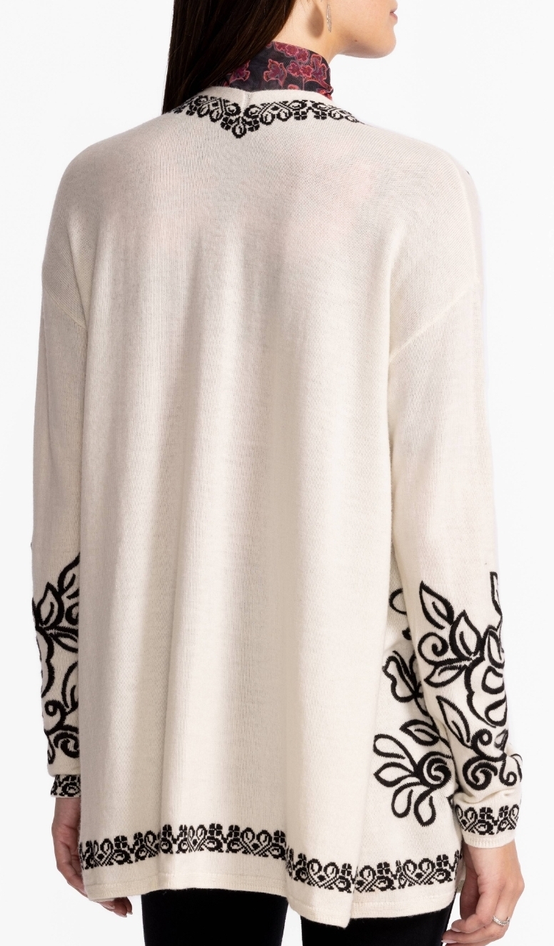 Crafted from a luxurious silk and cashmere blend, the Bella Drape Cardigan is the perfect combination of comfort and elevated style. Featuring a V neckline at the back and an open front, this unique cardigan is enhanced with intricate placement embroidery details. Layer over a silk tank and linen pants for a breezy look perfect for the warmest days.