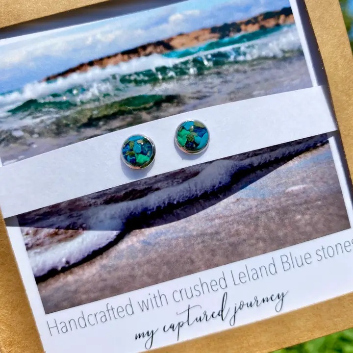 My Captured Journey crushes Leland Blue stones that they find, and they include a variety of stones colors in each earring.