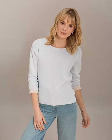 Product Description A repeat style from Alashan! Thermal texture knit Reversible with raw edges on reverse Relaxed fit Roll cuffs Scoop neck Long sleeve 95% cotton, 5% cashmere