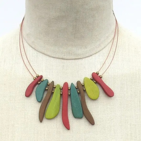 Four colors and styles of wood sticks with gold bead spacers hang from a double layer plastic bronze wire.